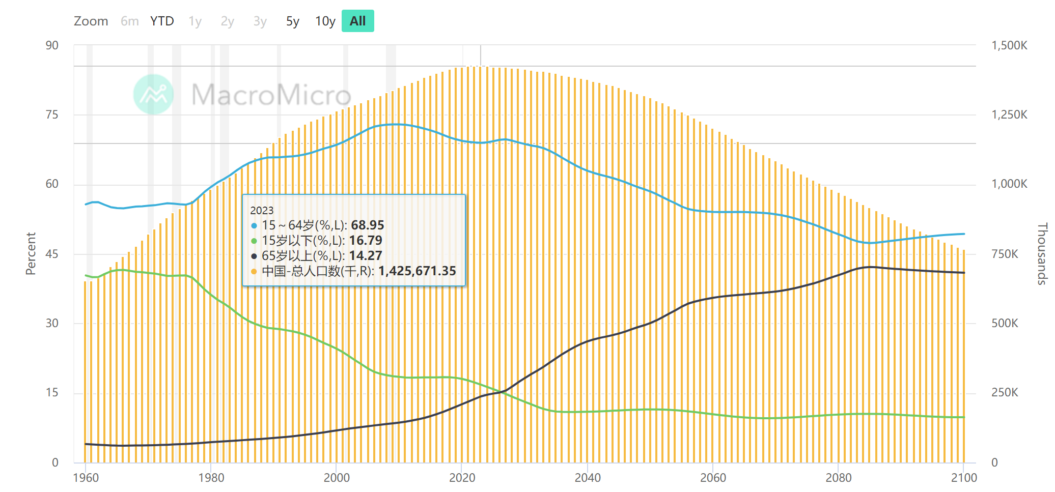 - 65岁及以上人口占比,超7%老龄化社会,超14%老龄社会,超21%超老龄社会。中国已到15%