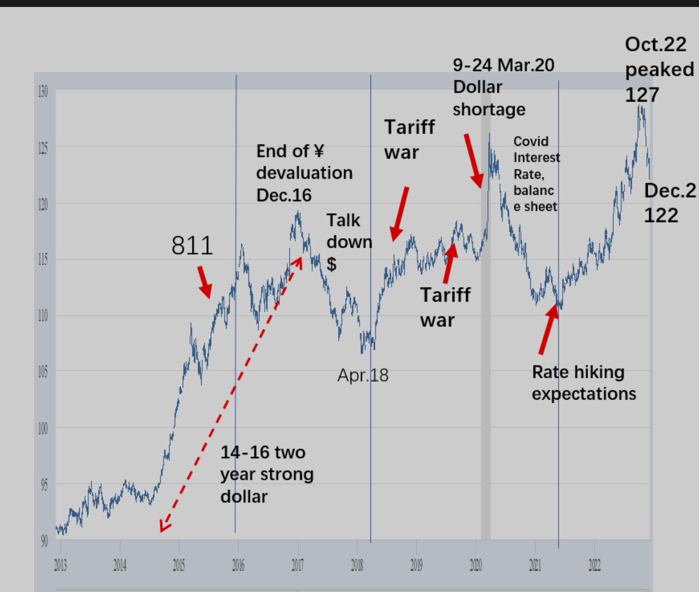 2015年后,国内主要担心人币贬值过快。汇改之后一直到2016年底,资本外流,人币一直面临贬值压力,央行外汇储备消耗了近1万亿美元。2016底-2018年3月,人币进入升值通道。2018年因中美贸易战关系,再次出现贬值趋向,一直到2020年5月。
