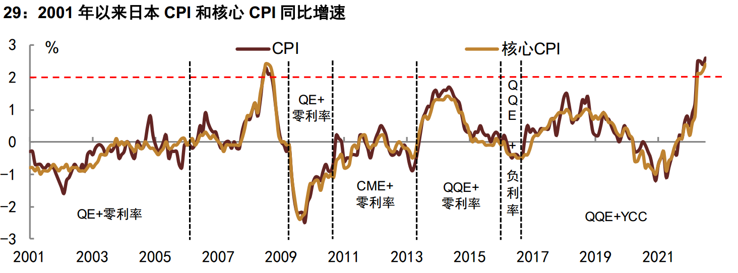 在2006年退出第一次QE的同时,BOJ也宣布了The Bank’s thinkning on Price Stability. 相当于是宣布将通胀目标限定在1%左右。刚刚开始加了一点息到0.5%又碰到GFC,在2008年降息回到0.1%。同期因为英美降息更多,降息差导致日元升值,对经济造成很大冲击。此时政策利率接近0已经无空间,2010年10月BOJ推出Comprehensive Monetary Easing,首先是继续降低政策利率到0-0.1%,其次加强forward guidance,第三是建立the Asset Purchase Programme来购买各种资产,如JGBs, commercial paper, corporate bonds, exchange traded funds(ETFs) and Japan Real Estate Investment Trusts(J-REITs)。2013年1月,将通胀目标调整为2%,同时推出the open-ended asset purchasing method,即购买金融资产但不设置termination date。同年4月,推出Quantitative and Qualitative Easing(QQE),这个扩张货币政策是安倍三支箭中其一。再次将操作目标从call rate换为monetary base。2016年1月29日,BOJ推出负利率。