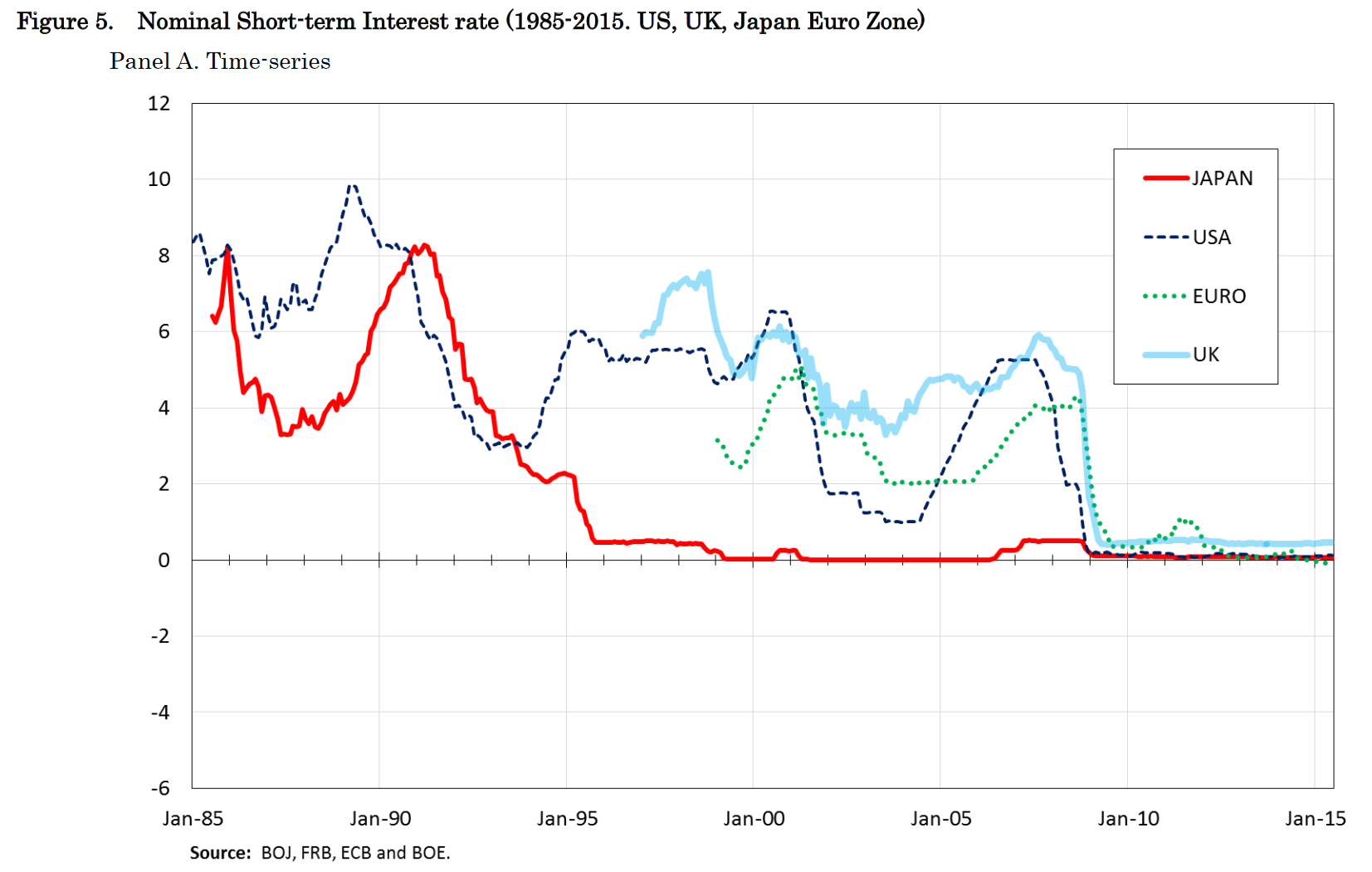BOJ在1999年12月12日首次推出零利率。2001年3月19日,推出第一次QE,政策目标从overnight call rate转变为outstanding balance of the current accounts at the BOJ. 在2006年3月9日退出QE之前,BOJ一直在扩张资产负债表,这一过程中主要购买短期国债。但2002年10月,BOJ开始从商业银行购买股票,算事最早的credit easing policy了。